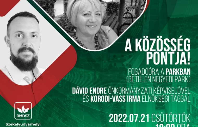 A fogadóórát Dávid Endre önkormányzati képviselő és Korodi-Vass Irma helyi szervezeti alelnök tartja.