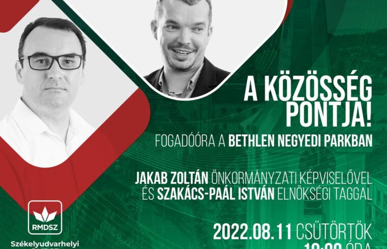 Események2022-08-09 FOLYTATÓDNAK A KIHELYEZETT FOGADÓÓRÁK Kihelyezett fogadóóra Jakab Zoltánnal és Szakács-Paál Istvánnal Bízunk benne, hogy az idő velünk lesz, mert csütörtökön újra ott leszünk a Bethlen negyedi parkban Forduljanak hozzánk bizalommal! Hasonló bejegyzések KözTérre visszük az emberek problémáit!Mága Zoltán megtöltötte a Sportcsarnokot…Jónak lenni jó! – jótékonysági…KIBESZÉLŐ – Szólj bele az…Október 23-i megemlékezésSzékely Nemzetgyűlés 175. évfordulója!Emlékezünk!Az RMDSZ Nőszervezet 10. születésnapjaA KözTér napok számokbanPanelbeszélgetésén a fenntartható gazdaságról a…